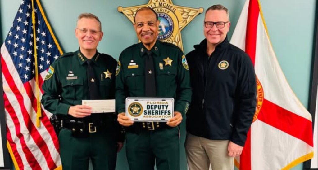 FDSA Deputy Executive Director John Creamer presents hurricane relief check to Leon County Sheriff Walt McNeil and Undersheriff Ron Cave. More than $200,000 in donations was given from the Lend a Hand Fund to support deputies across 15 counties as they recover from hurricanes in 2024.